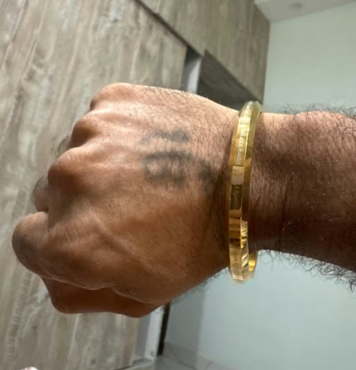 - Gloss bracelet for men in a round flat kada style, featuring the Ik Onkar Satnam Mantra.